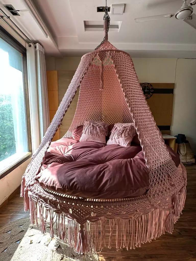 Ideal for bedrooms and living rooms, this macramé hanging swing chair instantly becomes a cozy retreat and a stunning décor focal point.