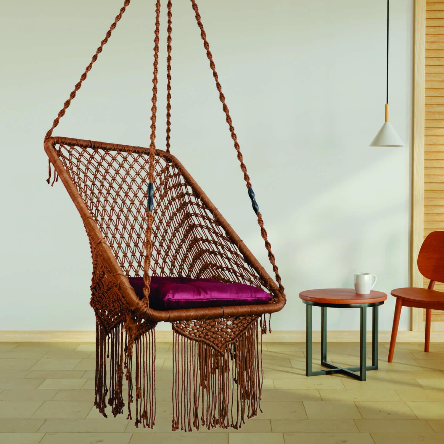 This brown macrame hanging swing chair is a perfect blend of traditional craftsmanship and modern comfort. Handwoven with premium cotton ropes, the chair offers excellent durability while maintaining a soft, breathable seating experience. The earthy brown tone enhances bohemian, rustic, and contemporary interiors, making it a versatile décor piece.