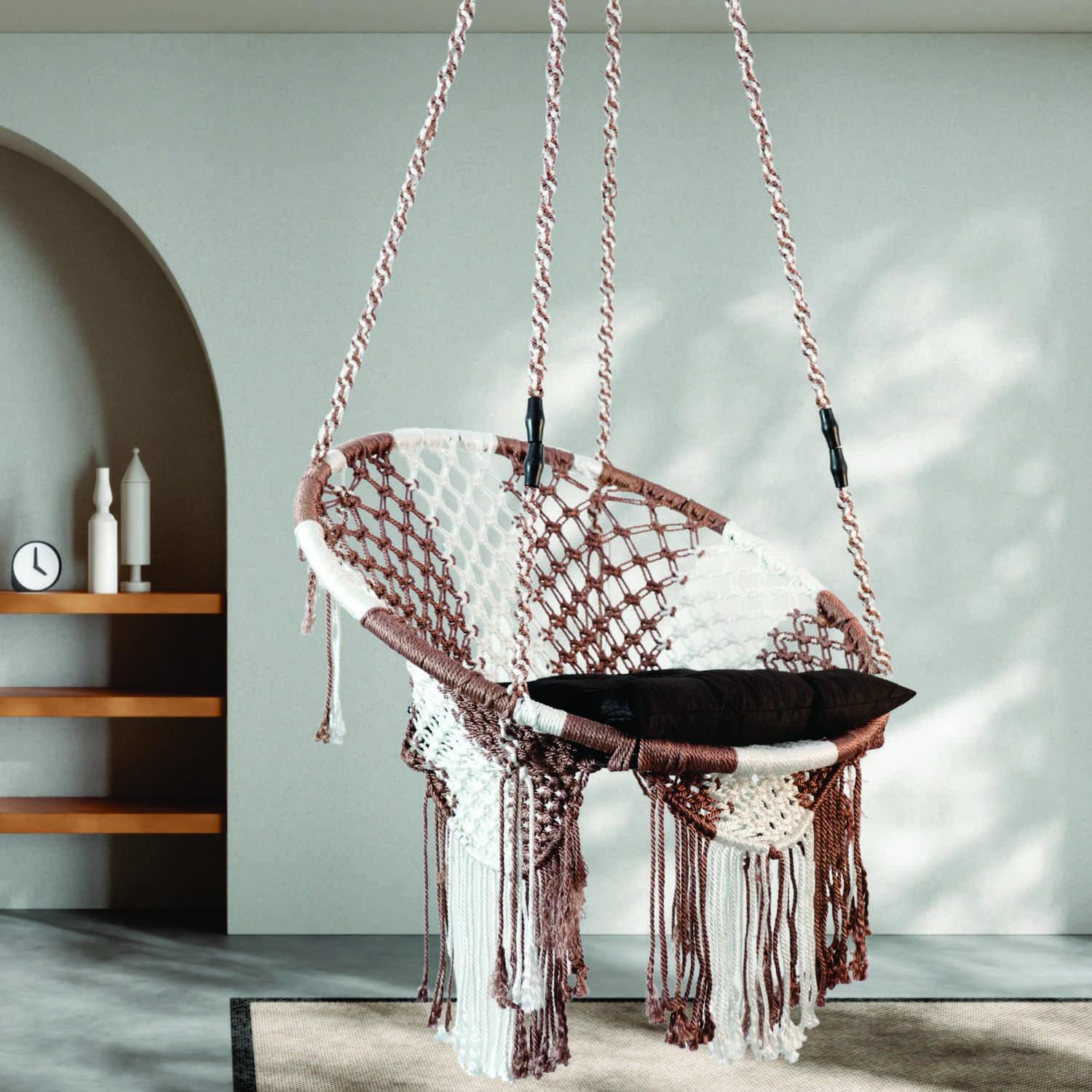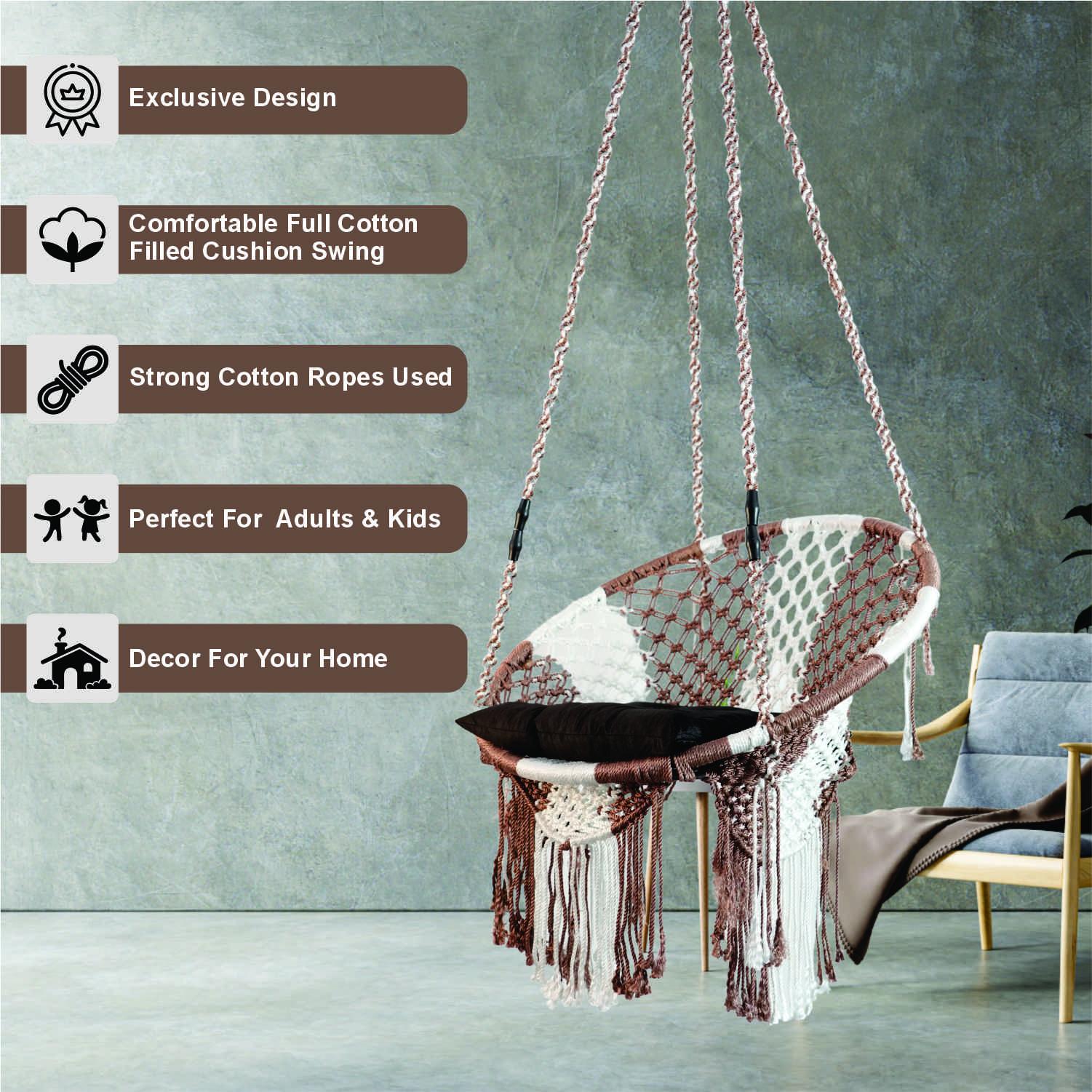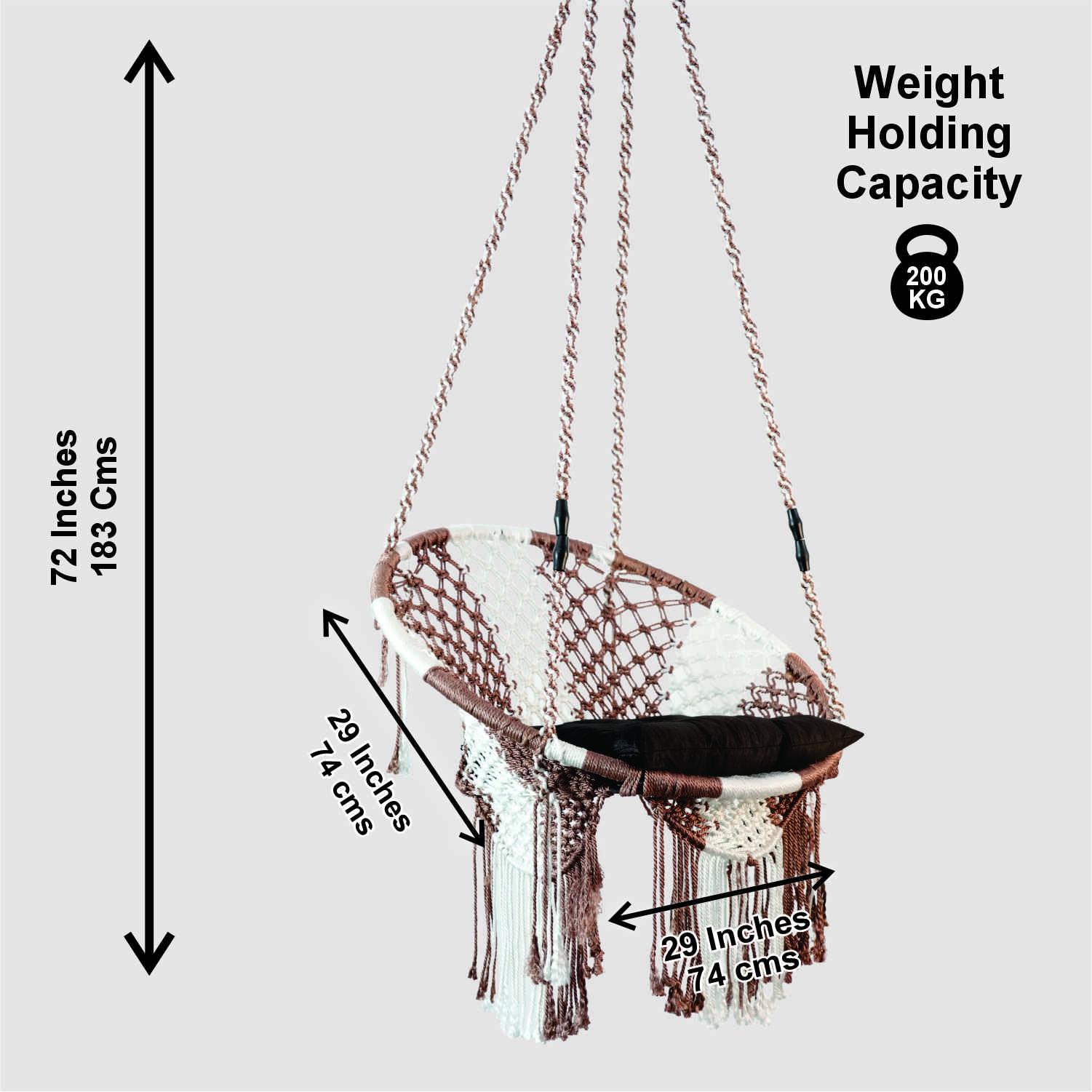 Add warmth, comfort, and timeless elegance to your space with this handcrafted brown & white macrame jula round shape hanging swing chair. Expertly woven using high-quality cotton ropes, this swing chair blends durability with a soft, breathable seating experience.