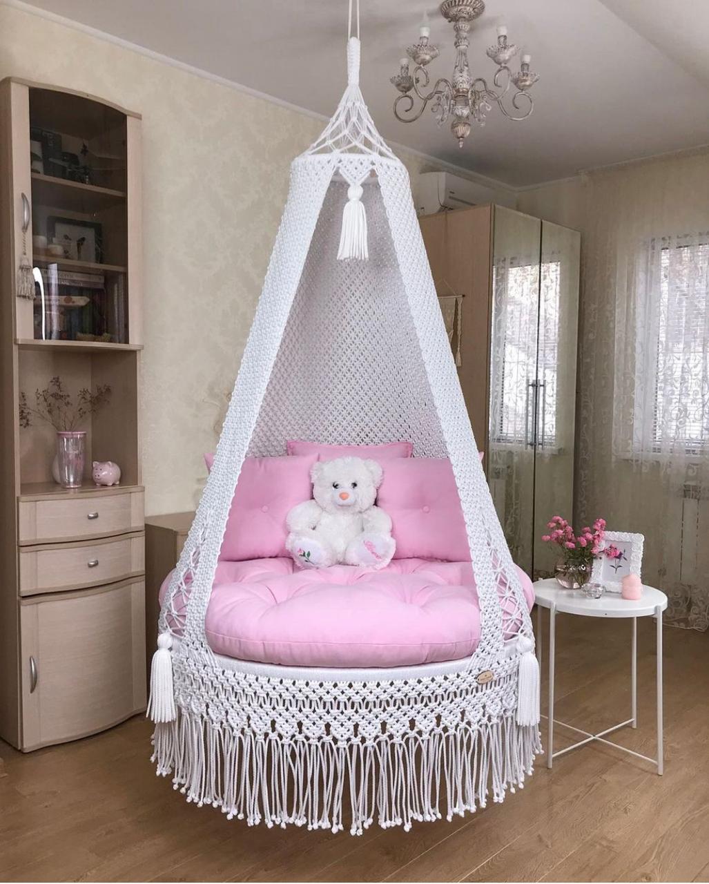 Crafted from strong cotton ropes, this swing chair offers a heavy-duty weight capacity of up to 200 kg, making it suitable for adults as well as children. The natural off-white rope colour paired with the pastel pink cushion adds a soft, luxurious look to any interior.