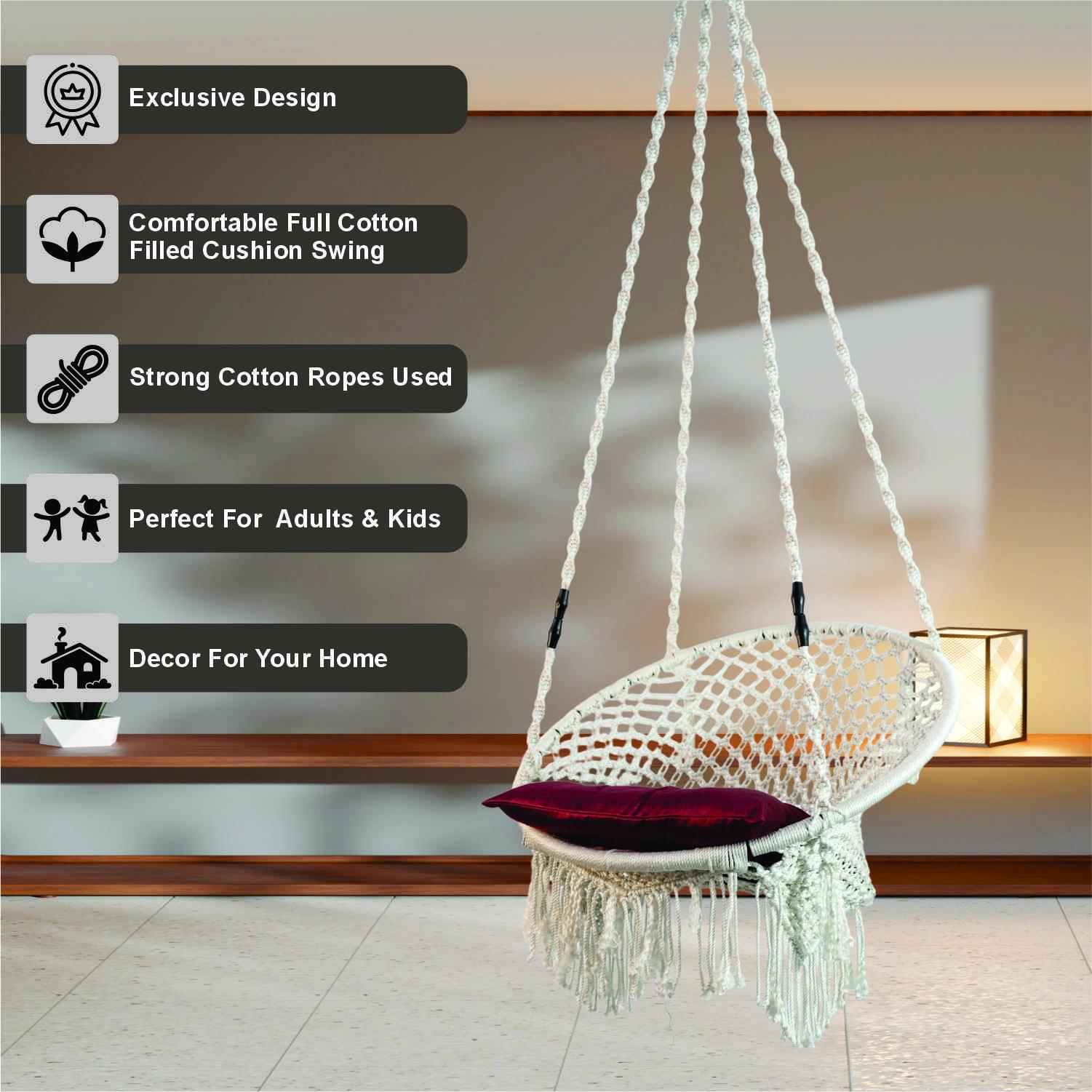 Create a serene sanctuary with our Off-White Macrame Round Hanging Swing Chair. This handwoven masterpiece blends traditional craftsmanship with modern durability. The neutral off-white/cream tone offers a clean, airy aesthetic that brightens up any space, making it a top-tier choice for modern boho home décor.