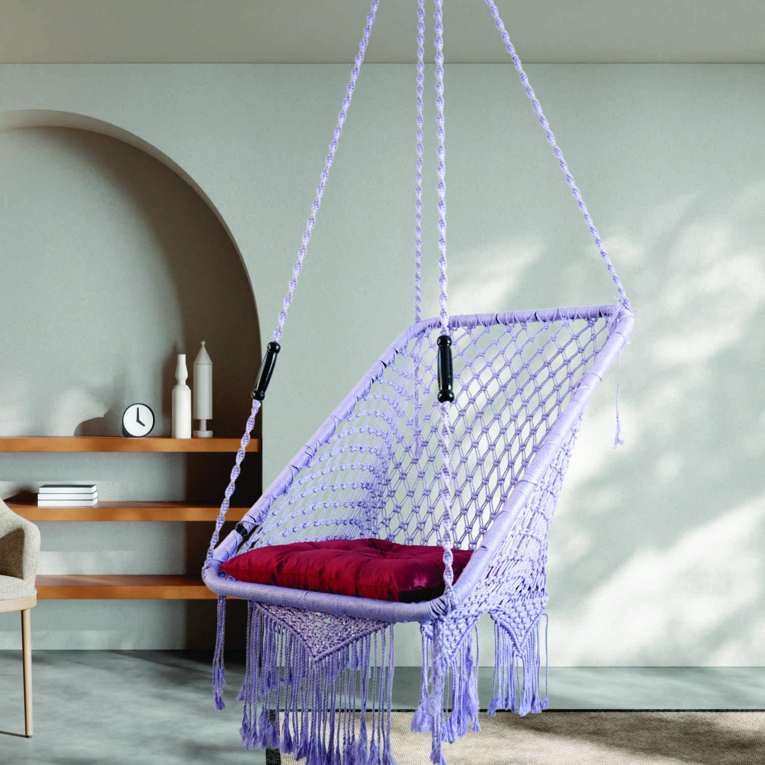 Experience the perfect blend of style and stability with our Lavender Macrame Hanging Swing Chair. This beautifully crafted jula is made from high-quality, strong cotton ropes, ensuring it remains a centrepiece in your home for years to come. The unique lavender hue offers a refreshing and calming vibe, making it a standout choice for those looking to upgrade their home decor with a pop of sophisticated colour.
