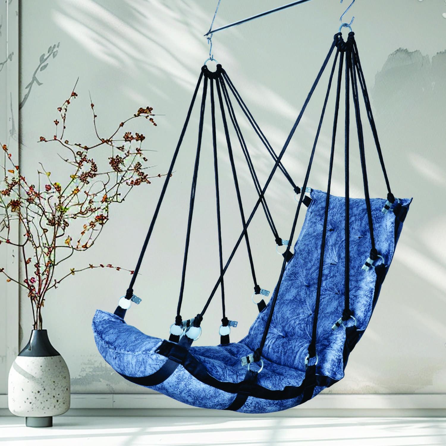 Experience comfort and style with this premium cotton rope hanging swing chair (Jula) featuring a soft full-cotton cushion, strong braided ropes, and a modern cradle-shaped design. With a high 200 KG weight capacity and elegant blue colour, it is perfect for home décor, balcony, bedroom, or garden relaxation.