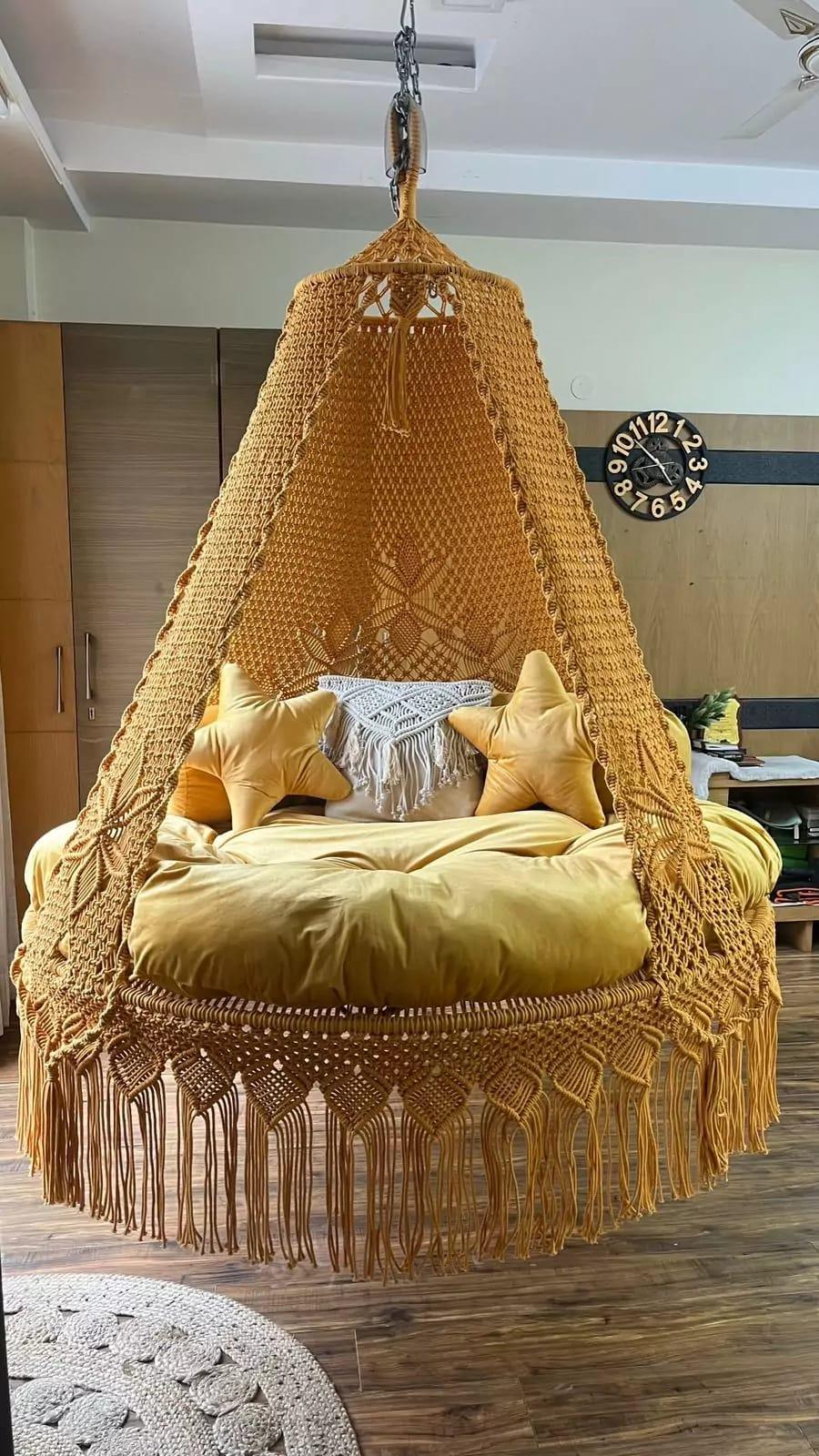 Whether placed in a bedroom, living room, or lounge area, this macramé hanging swing chair becomes a striking focal point and a cozy retreat within your home.