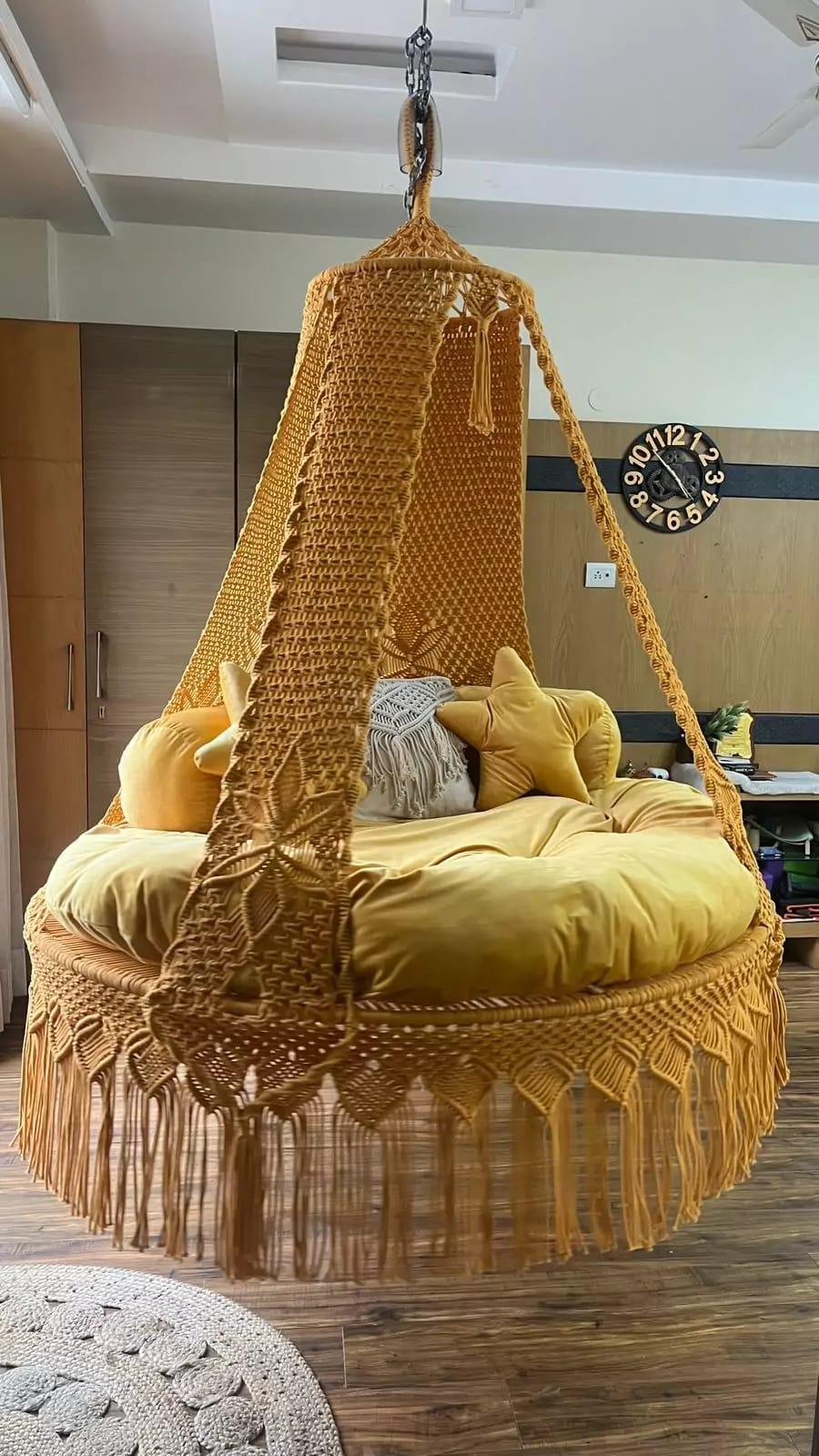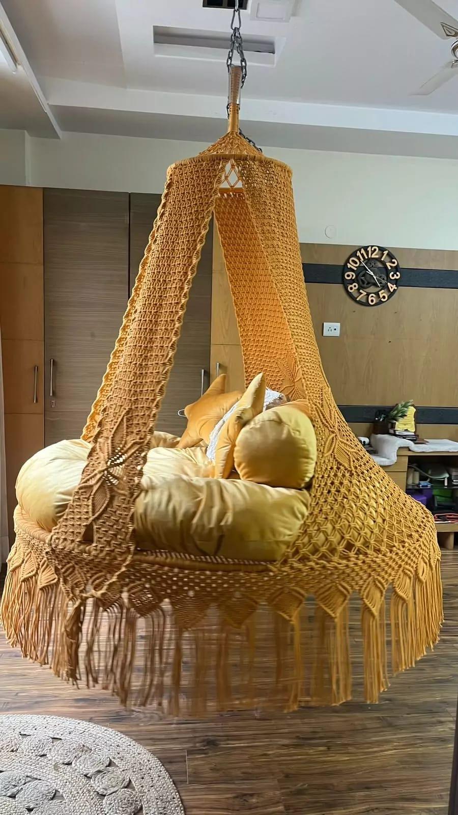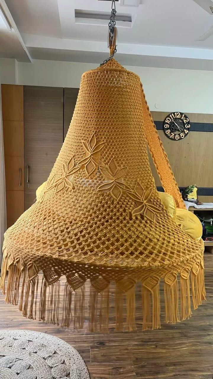 This handcrafted macrame cotton rope hanging swing chair is a perfect blend of comfort, durability, and artistic design. The swing features an elegant open-weave macrame pattern with leaf-inspired detailing and long hanging fringes that enhance its premium handcrafted appeal.